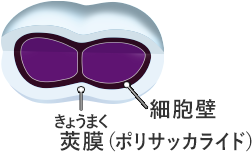 肺炎球菌は小児の上気道 (鼻腔)の常在菌の1つで、小児の20~40%の割合で鼻咽腔より検出されます。肺炎球菌の多くは下図のように莢膜を有しており、それが病原性の主体になります。莢膜型は血清型ともよばれ95種類以上に分類されます。