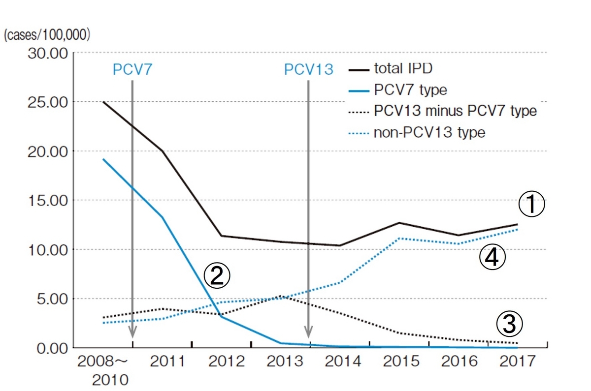 IPDの総数は、肺炎球菌ワクチン導入前の50%に下がりどまっています(①)。PCV7(②), PCV13(③)に含まれる血清型が原因のIPDは著明に減少しております。しかし、PCV13でカバーできない血清型によるIPDが導入前の304%に増加しておりました(④) 。
